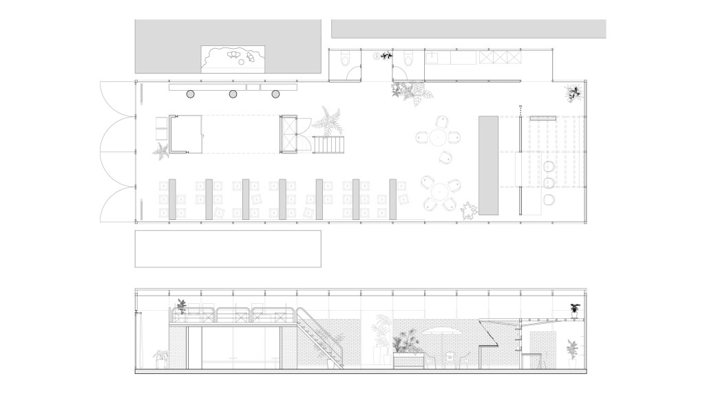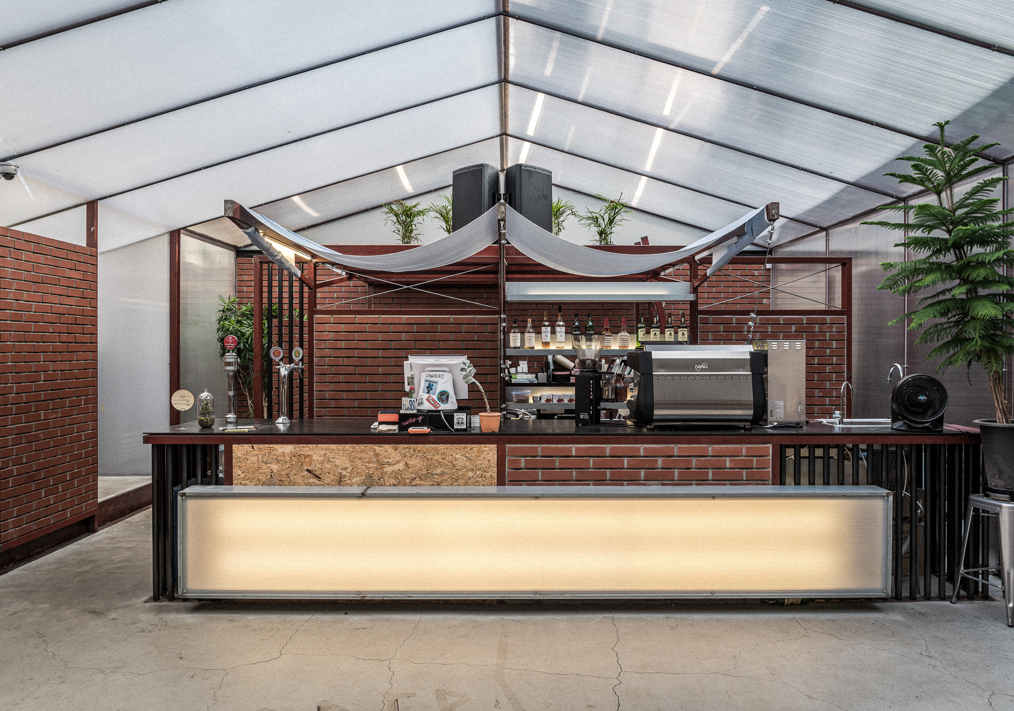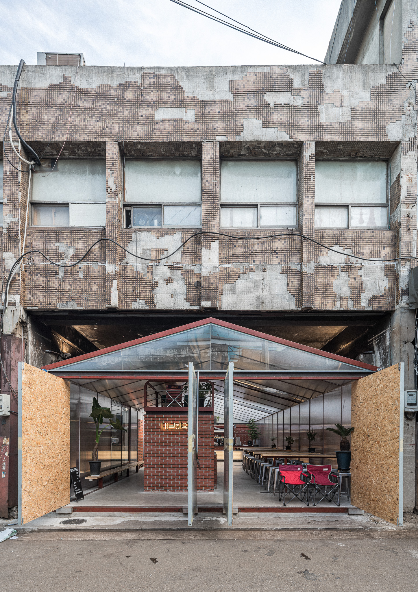 The steel-pipes frame of the space were supplied from local steal factory and the finish was expressed in transparent polycarbonate, which has better architectural durability than plastic. Because of the characteristics of the materials, a cold atmosphere can be created, so the solid walls are intended to be warm with masonry. Inside, there is no lighting other than a bar light. Inside, people are less susceptible to burdensome lighting interference. During the day, the space is brightened with natural light, and at night, the space is illuminated with external artificial light. At night, the walls of the existing ironworks complex are projected from the walls of the Vinyl-house by light, so you can experience a past and present of the ironworks complex in a roundabout way. In addition to the fixed table, inexpensive exterior furniture that can only be found in front of Korean convenience stores is included. I think it is a small gesture that expresses Korean emotions.